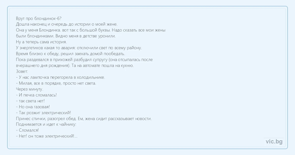 Врут про блондинок-6? Дошла наконец и очередь до истории о моей жене. Она у меня Блондинка. вот так с большой буквы. Надо сказать все мои жены были блондинками. Видно меня в детстве уронили. Ну а теперь сама история. У энергетиков какая то авария: отключили свет по всему району. Время близко к обеду, решил заехать домой пообедать. Пока раздевался в прихожей разбудил супругу (она отсыпалась после вчерашнего дня рождения). Та на автомате пошла на кухню. Зовет: - У нас лампочка перегорела в холодильнике. - Милая, все в порядке, просто нет света. Через минуту. - И печка сломалась! - так света нет! - Но она газовая! - Так розжиг электрический! Принес спички, разогрел обед. Ем, жена сидит рассказывает новости. Поднимается и идет к чайнику: - Сломался! - Нет! он тоже электрический! Посидела. - Ну что я сижу без дела, пойду постираю. Возвращается. смеется: - Вот я глупая, там же темно! Ага! Еще не учла, что машинка электрическая! Еще посидела. - Ой! Мой сериал начался! Убежала. Я даже ложку отложил, жду продолжения. Возвращается минут через 5. Грустная, задумчивая. Посидела, помолчала. Потом. грустно так: - Не понимаю! Как раньше без электричесва обходились? Как телевизор смотрели? При свечках. что-ли?