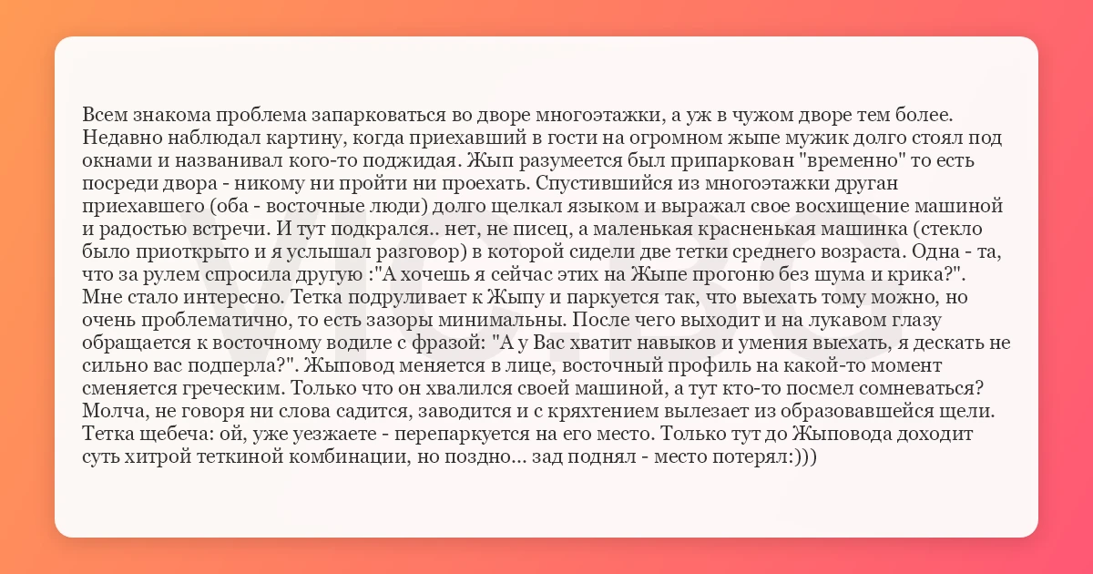 Недавно наблюдал картину, когда приехавший в гости на огромном жыпе мужик долго стоял под окнами и названивал кого-то поджидая. Жып разумеется был припаркован "временно" то есть посреди двора - никому ни пройти ни проехать. Спустившийся из многоэтажки друган приехавшего (оба - восточные люди) долго щелкал языком и выражал свое восхищение машиной и радостью встречи. И тут подкрался.. нет, не писец, а маленькая красненькая машинка (стекло было приоткрыто и я услышал разговор) в которой сидели две тетки среднего возраста. Одна - та, что за рулем спросила другую :"А хочешь я сейчас этих на Жыпе прогоню без шума и крика?". Мне стало интересно. Тетка подруливает к Жыпу и паркуется так, что выехать тому можно, но очень проблематично, то есть зазоры минимальны. После чего выходит и на лукавом глазу обращается к восточному водиле с фразой: "А у Вас хватит навыков и умения выехать, я дескать не сильно вас подперла?". Жыповод меняется в лице, восточный профиль на какой-то момент сменяется греческим. Только что он хвалился своей машиной, а тут кто-то посмел сомневаться? Молча, не говоря ни слова садится, заводится и с кряхтением вылезает из образовавшейся щели. Тетка щебеча: ой, уже уезжаете - перепаркуется на его место. Только тут до Жыповода доходит суть хитрой теткиной комбинации, но поздно... зад поднял - место потерял:)))