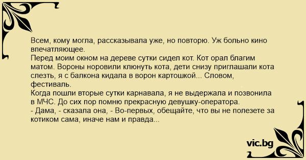 - Дама, - сказала она, - Во-первых, обещайте, что вы не полезете за котиком сама, иначе нам и правда придется приехать, и не одним, а со скорой помощью. Договорились? Теперь слушайте: берете флакон валерьянки и выливаете на ствол дерева на высоте вытянутой руки. ВСЁ.