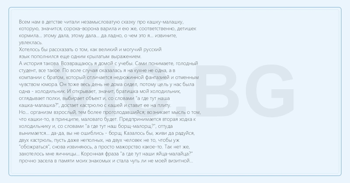 Всем нам в детстве читали незамысловатую сказку про кашку-малашку, которую, значится, сорока-ворона варила и ею же, соответственно, детишек кормила… этому дала, этому дала… да ладно, о чем это я… извините, увлеклась. Хотелось бы рассказать о том, как великий и могучий русский язык пополнился еще одним крылатым выражением. А история такова. Возвращаюсь я домой с учебы. Сами понимаете, голодный студент, все такое. По воле случая оказалась я на кухне не одна, а в компании с братом, который отличается недюжинной фантазией и отменным чувством юмора. Он тоже весь день не дома сидел, потому цель у нас была одна - холодильник. И открывает, значит, братишка мой холодильник, оглядывает полки, выбирает объект и, со словами "а где тут наша кашка-малашка?", достает кастрюлю с кашей и ставит ее на плиту. Но… организм взрослый, тем более проголодавшийся; возникает мысль о том, что кашки-то, в принципе, маловато будет. Предпринимается вторая ходка к холодильнику и, со словами "а где тут наш борщ-малорщ?", оттуда вынимается… да-да, вы не ошиблись - борщ. Казалось бы, живи да радуйся, двух кастрюль, пусть даже неполных, на двух человек не то, чтобы уж "обожраться", снова извиняюсь, а просто мажорство какое-то. Так нет же, захотелось мне яичницы… Коронная фраза "а где тут наши яйца-малайца?" прочно засела в памяти моих знакомых и стала чуть ли не моей визитной карточкой на долгое, очень долгое время… (c) Tanusha