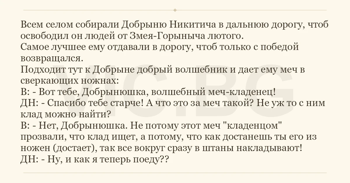 Всем селом собирали Добрыню Никитича в дальнюю дорогу, чтоб освободил он людей от Змея-Горыныча лютого. Самое лучшее ему отдавали в дорогу, чтоб только с победой возвращался. Подходит тут к Добрыне добрый волшебник и дает ему меч в сверкающих ножнах: В: - Вот тебе, Добрынюшка, волшебный меч-кладенец! ДН: - Спасибо тебе старче! А что это за меч такой? Не уж то с ним клад можно найти? В: - Нет, Добрынюшка. Не потому этот меч "кладенцом" прозвали, что клад ищет, а потому, что как достанешь ты его из ножен (достает), так все вокруг сразу в штаны накладывают! ДН: - Ну, и как я теперь поеду??
