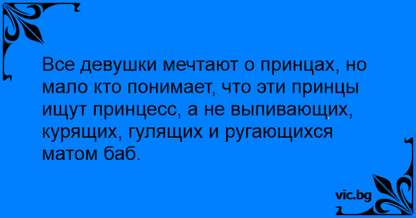 Все девушки мечтают о принцах, но мало кто понимает, что эти принцы ищут принцесс, а не выпивающих, курящих, гулящих и ругающихся матом баб.