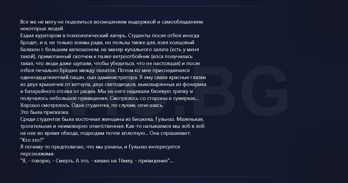 Все же не могу не поделиться восхищением выдержкой и самообладанием некоторых людей. Ездил куратором в психологический лагерь. Студенты после отбоя иногда бродят, и я, не только хохмы ради, но пользы также для, взял холщовый балахон с большим капюшоном, на манер купального халата (есть у меня такой), примотанный скотчем к палке ветроотбойник (коса получилась такая, что люди даже щупали, чтобы убедиться, что не настоящая) и после отбоя печально бродил между палаток. Потом ко мне присоединился одиннадцатилетний пацан, сын администратора. Я ему сваял красные глазки из двух крышечек от кетчупа, двух светодиодов, выковырянных из фонарика и батарейного отсека от рации. Мы на него надевали бязевую тряпку и получалось небольшое привидение. Смотрелось со стороны в сумерках... Хорошо смотрелось. Одна студентка, по слухам, описалась. Это была присказка. Среди студентов была восточная женщина из Бишкека, Гульназ. Маленькая, трогательная и неимоверно ответственная. Как-то натыкаемся мы лоб в лоб на нее во время обхода, подходим почти вплотную... Она спрашивает: "Кто это?" Я почему-то предполагаю, что мы узнаны, и Гульназ интересуется персонажами. "Я, - говорю, - Смерть. А это, - киваю на Тёмку, - привидение" "Я так и поняла" "А почему не испугалась?" - интересуюсь я, может, в костюмах напутали что? "Я испугалась" "А почему не кричала?" "Так ведь спят же все..." Многие из нас смогут сдержать вопль ужаса для того, чтобы не будить спящих соратников? Есть женщины в русских селеньях, как будто в нерусских их нет.
