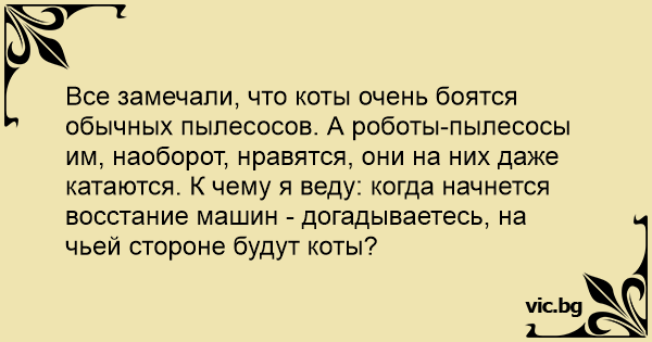 Все замечали, что коты очень боятся обычных пылесосов. А роботы-пылесосы им, наоборот, нравятся, они на них даже катаются. К чему я веду: когда начнется восстание машин - догадываетесь, на чьей стороне будут коты?