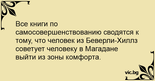 Все книги по самосовершенствованию сводятся к тому, что человек из Беверли-Хиллз советует человеку в Магадане выйти из зоны комфорта.