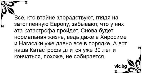 Все, кто втайне злорадствуют, глядя на затопленную Европу, забывают, что у них эта катастрофа пройдет. Снова будет нормальная жизнь, ведь даже в Хиросиме и Нагасаки уже давно все в порядке. А вот наша Катастрофа длится уже 30 лет и кончаться, похоже, не собирается.