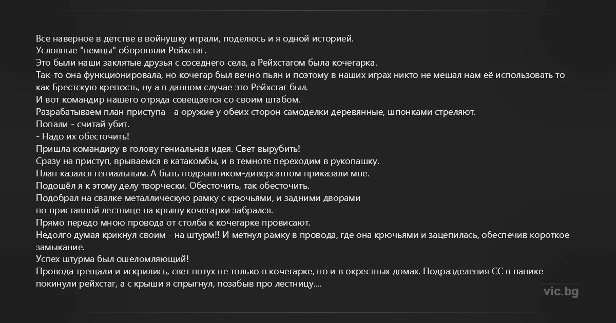 Это были наши заклятые друзья с соседнего села, а Рейхстагом была кочегарка.