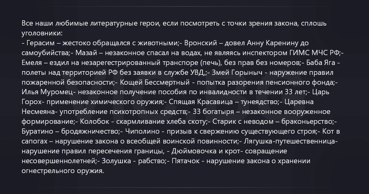 Все наши любимые литературные герои, если посмотреть с точки зрения закона, сплошь уголовники: - Герасим – жестоко обращался с животными;- Вронский – довел Анну Каренину до самоубийства;- Мазай – незаконное спасал на водах, не являясь инспектором ГИМС МЧС РФ;- Емеля – ездил на незарегестрированный транспоре (печь), без прав без номеров;- Баба Яга - полеты над территорией РФ без заявки в службе УВД,;- Змей Горыныч - наружение правил пожаренной безопасности;- Кощей Бессмертный - попытка разорения пенсионного фонда;- Илья Муромец- незаконное получение пособия по инвалидности в течении 33 лет;- Царь Горох- применение химического оружия;- Спящая Красавица – тунеядство;- Царевна Несмеяна- употребление психотропных средств;- 33 богатыря – незаконное вооруженное формирование;- Колобок - скармливание хлеба скоту;- Старик с неводом – браконьерство;- Буратино – бродяжничество;- Чиполино - призыв к свержению существующего строя;- Кот в сапогах – нарушение закона о всеобщей воинской повинности;- Лягушка-путешественница- нарушение правил пересечения границы, - Дюймовочка и крот- совращение несовершеннолетней;- Золушка - рабство;- Пятачок - нарушение закона о хранении огнестрельного оружия.