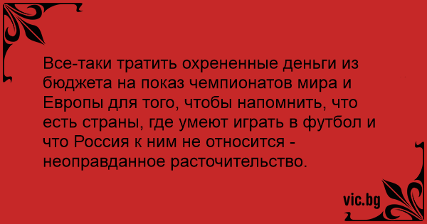 Все-таки тратить охрененные деньги из бюджета на показ чемпионатов мира и Европы для того, чтобы напомнить, что есть страны, где умеют играть в футбол и что Россия к ним не относится - неоправданное расточительство.