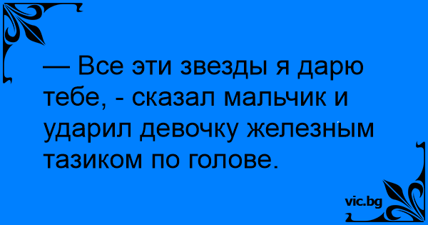 — Все эти звезды я дарю тебе, - сказал мальчик и ударил девочку железным тазиком по голове.