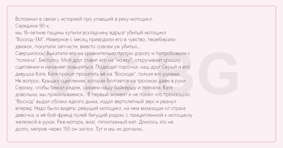 Вспомнил в связи с историей про упавший в реку мотоцикл. Середина 90-х, мы 16-летние пацаны купили вскладчину вдрызг убитый мотоцикл "Восход-3М". Наверное с месяц приводили его в чувство, перебирали движок, покупали запчасти, вместо совсем уж убитых... Свершилось! Выкатили его на сравнительно пустую дорогу и попробовали с "толкача". Бестолку. Мой друг ставит его на "ножку", откручивает крышку сцепления и начинает ковыряться. Подходит парочка: наш друг Серый и его девушка Катя. Катя просит прокатить её на "Восходе", толкая его руками. Не вопрос. Крышку сцепления, которая болтается на тросиках даем в руки Серому, чтобы бежал рядом, сажаем нашу байкершу и погнали. Катя довольна, мы прикалываемся... В первый момент я не понял что произошло. "Восход" выдал облако едкого дыма, издал вертолетный звук и рванул вперед. Надо было видеть: ревущий мотоцикл, на нем визжащая от страха девочка, и её бой-френд пулей бегущий рядом, с прицепленной к мотоциклу железкой в руках. Рев мотора, визг, пятиэтажный мат. Длилось это не долго, метров через 150 он заглох. Тут и мы их догнали...