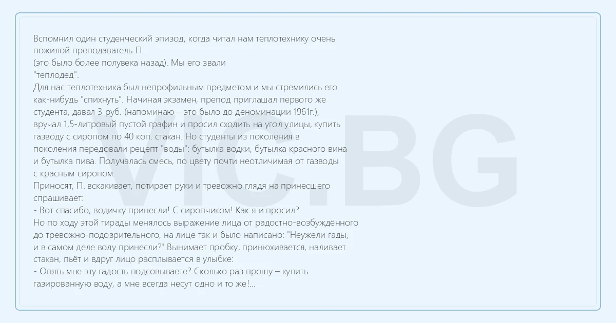 Вспомнил один студенческий эпизод, когда читал нам теплотехнику очень пожилой преподаватель П. (это было более полувека назад). Мы его звали "теплодед". Для нас теплотехника был непрофильным предметом и мы стремились его как-нибудь "спихнуть". Начиная экзамен, препод приглашал первого же студента, давал 3 руб. (напоминаю – это было до деноминации 1961г.), вручал 1,5-литровый пустой графин и просил сходить на угол улицы, купить газводу с сиропом по 40 коп. стакан. Но студенты из поколения в поколения передовали рецепт "воды": бутылка водки, бутылка красного вина и бутылка пива. Получалась смесь, по цвету почти неотличимая от газводы с красным сиропом. Приносят, П. вскакивает, потирает руки и тревожно глядя на принесшего спрашивает: - Вот спасибо, водичку принесли! С сиропчиком! Как я и просил? Но по ходу этой тирады менялось выражение лица от радостно-возбуждённого до тревожно-подозрительного, на лице так и было написано: "Неужели гады, и в самом деле воду принесли?" Вынимает пробку, принюхивается, наливает стакан, пьёт и вдруг лицо расплывается в улыбке: - Опять мне эту гадость подсовываете? Сколько раз прошу – купить газированную воду, а мне всегда несут одно и то же! К концу экзамена выпускать "теплодеда" из аудитории было небезопасно, он сидел в обнимку со старостой и варнякал: - Друзья, я тоже был студентом! Люблю молодежь! Я никого стипендии не лишил? А отличников не лишил повышенной стипендии? Я же всё понимаю, я вас люблю!!! М-М-м-у!!! – так он целует старосту в приступе уважения.
