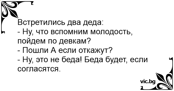 Встретились два деда:<br />- Ну, что вспомним молодость, пойдем по девкам?<br />- Пошли А если откажут?<br />- Ну, это не беда! Беда будет, если согласятся.