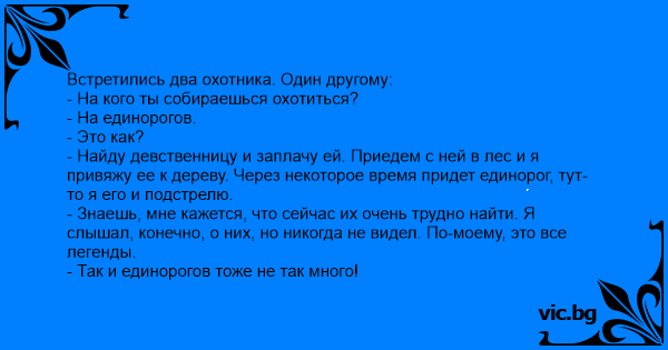 - Найду девственницу и заплачу ей. Приедем с ней в лес и я привяжу ее к дереву. Через некоторое время придет единорог, тут-то я его и подстрелю.