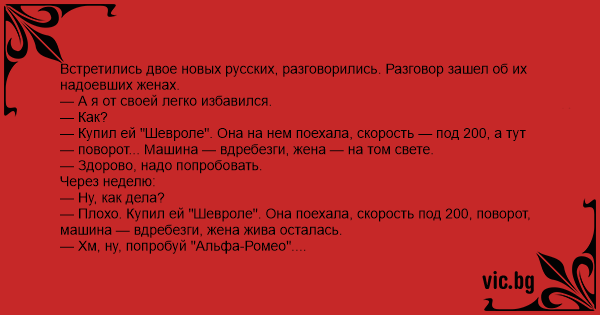 Susitinka du naujieji rusai. Pradėjo šnekėtis apie šeimyninį gyvenimą ir apie nusibodusias žmonas. Vienas sako: - O aš savosios atsikračiau. - Kaip!? - Na kaip, nupirkau aš jai "Alfa-Romeo". Ji...