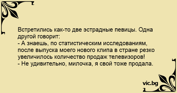 - А знаешь, по статистическим исследованиям, после выпуска моего нового клипа в стране резко увеличилось количество продаж телевизоров!