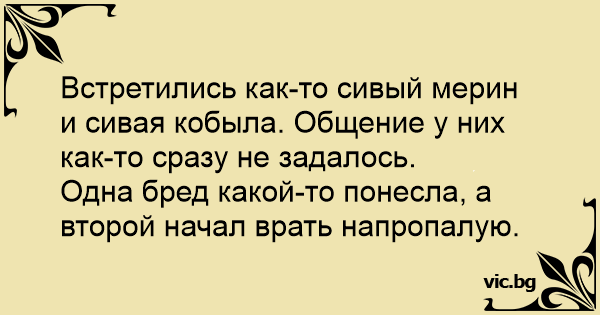 Встретились как-то сивый мерин и сивая кобыла. Общение у них как-то сразу не задалось.