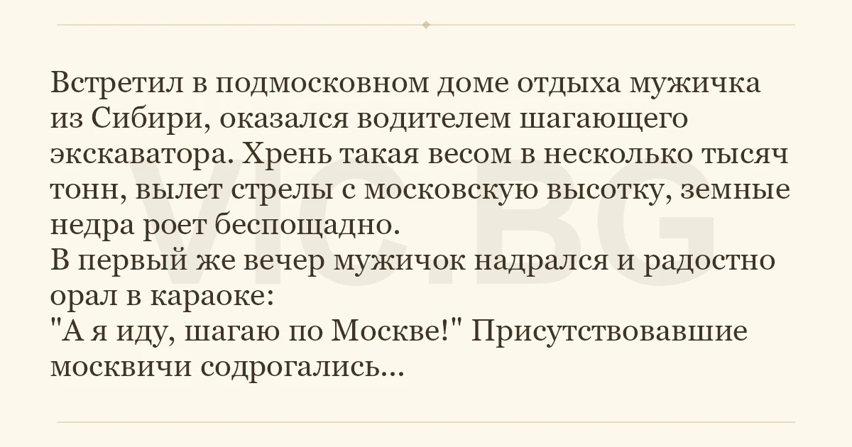 Встретил в подмосковном доме отдыха мужичка из Сибири, оказался водителем шагающего экскаватора. Хрень такая весом в несколько тысяч тонн, вылет стрелы с московскую высотку, земные недра роет беспощадно. В первый же вечер мужичок надрался и радостно орал в караоке: "А я иду, шагаю по Москве!" Присутствовавшие москвичи содрогались...