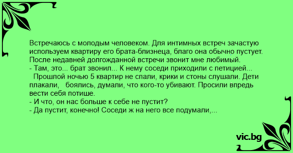 Встречаюсь с молодым человеком. Для интимных встреч зачастую используем квартиру его брата-близнеца, благо она обычно пустует. После недавней долгожданной встречи звонит мне любимый.