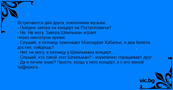 - Нет, не могу, в пятницу у Шпильмана концерт...