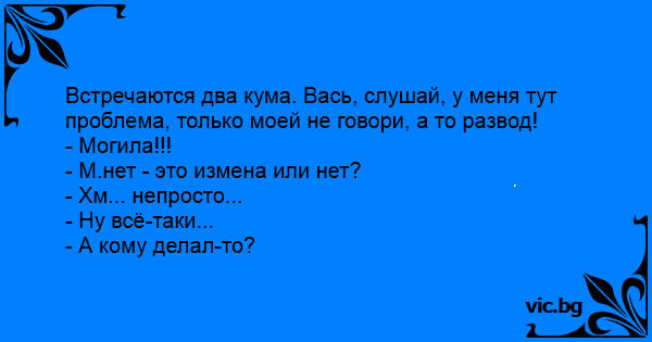 Встречаются два кума. Вась, слушай, у меня тут проблема, только моей не говори, а то развод!