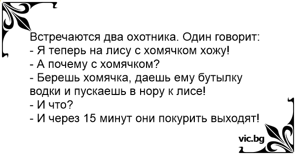 Встречаются два охотника. Один говорит:<br />- Я теперь на лису с хомячком хожу!<br />- А почему с хомячком?<br />- Берешь хомячка, даешь ему бутылку водки и пускаешь в нору к лисе!<br />- И что?<br />- И через 15 минут они покурить выходят!