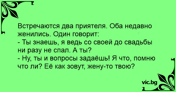 Срещат се двама приятели. Наскоро са се оженили и двамата. Единия разправя: