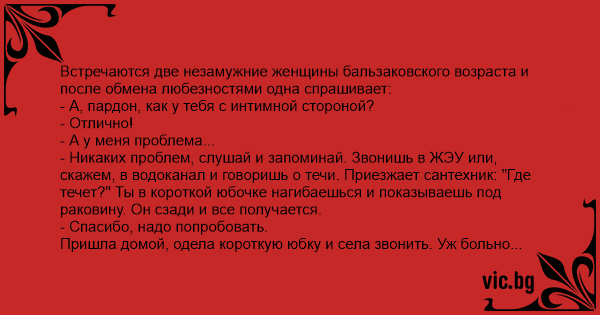 Встречаются две незамужние женщины бальзаковского возраста и после обмена любезностями одна спрашивает: - А, пардон, как у тебя с интимной стороной? - Отлично! - А у меня проблема... - Hикаких проблем, слушай и запоминай. Звонишь в ЖЭУ или, скажем, в водоканал и говоришь о течи. Приезжает сантехник: "Где течет?" Ты в короткой юбочке нагибаешься и показываешь под раковину. Он сзади и все получается. - Спасибо, надо попробовать. Пришла домой, одела короткую юбку и села звонить. Уж больно невтерпеж, телефоны долго искать, аварийная водоканала не отвечает, дай, думает, позвоню 04: - У меня газ идет! Приезжает слесарь и спрашивает: "Где?" Она наклоняется и показывает под газовую плиту, и в это время он сзади...! Она кричит: - HЕ ТУДА!!!!!!!!! Он: - Надо было в водоканал звонить, а мы-то газовики....