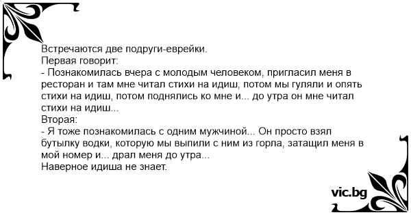 - Познакомилась вчера с молодым человеком, пригласил меня в ресторан и там мне читал стихи на идиш, потом мы гуляли и опять стихи на идиш, потом поднялись ко мне и... до утра он мне читал стихи на идиш...