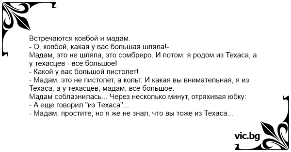 - Мадам, это не пистолет, а кольт. И какая вы внимательная, я из Техаса, а у техасцев, мадам, все большое.