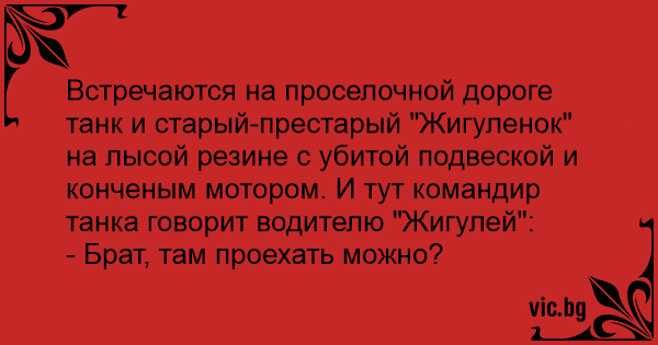 Встречаются на проселочной дороге танк и старый-престарый "Жигуленок" на лысой резине с убитой подвеской и конченым мотором. И тут командир танка говорит водителю "Жигулей":