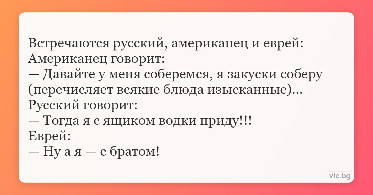 Встречаются русский, американец и еврей: Американец говорит:<br />— Давайте у меня соберемся, я закуски соберу (перечисляет всякие блюда изысканные)…<br />Русский говорит:<br />— Тогда я с ящиком водки приду!!!<br />Еврей:<br />— Ну а я — с братом!