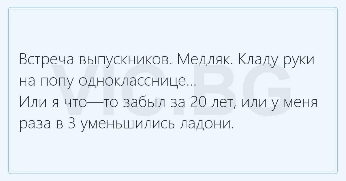Встреча выпускников. Медляк. Кладу руки на попу однокласснице... Или я что—то забыл за 20 лет‚ или у меня раза в 3 уменьшились ладони.