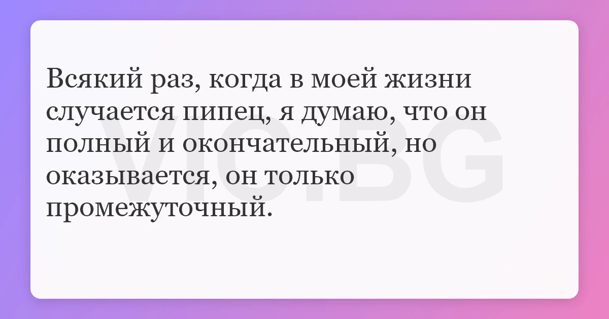 Всякий раз, когда в моей жизни случается пипец, я думаю, что он полный и окончательный, но оказывается, он только промежуточный.
