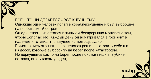 ВСЁ, ЧТО НИ ДЕЛАЕТСЯ - ВСЁ К ЛУЧШЕМУ Однажды один человек попал в кораблекрушение и был выброшен на необитаемый остров.