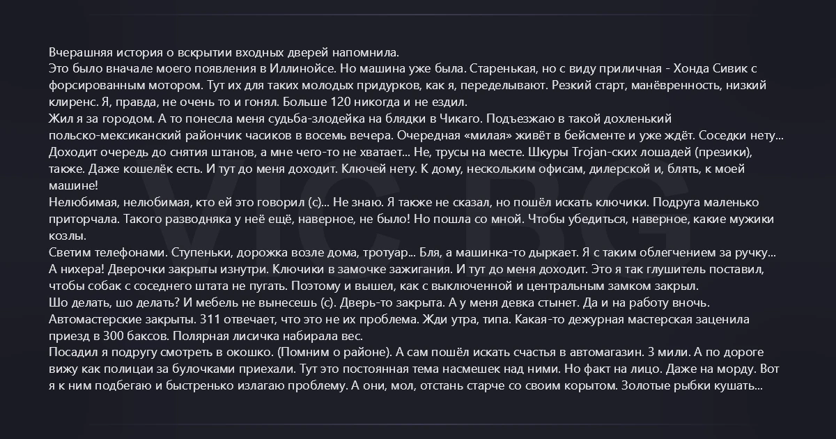 Вчерашняя история о вскрытии входных дверей напомнила. Это было вначале моего появления в Иллинойсе. Но машина уже была. Старенькая, но с виду приличная - Хонда Сивик с форсированным мотором. Тут их для таких молодых придурков, как я, переделывают. Резкий старт, манёвренность, низкий клиренс. Я, правда, не очень то и гонял. Больше 120 никогда и не ездил. Жил я за городом. А то понесла меня судьба-злодейка на блядки в Чикаго. Подъезжаю в такой дохленький польско-мексиканский райончик часиков в восемь вечера. Очередная «милая» живёт в бейсменте и уже ждёт. Соседки нету... Доходит очередь до снятия штанов, а мне чего-то не хватает... Не, трусы на месте. Шкуры Trojan-ских лошадей (презики), также. Даже кошелёк есть. И тут до меня доходит. Ключей нету. К дому, нескольким офисам, дилерской и, бляtь, к моей машине! Нелюбимая, нелюбимая, кто ей это говорил (с)... Не знаю. Я также не сказал, но пошёл искать ключики. Подруга маленько приторчала. Такого разводняка у неё ещё, наверное, не было! Но пошла со мной. Чтобы убедиться, наверное, какие мужики козлы. Светим телефонами. Ступеньки, дорожка возле дома, тротуар... Бля, а машинка-то дыркает. Я с таким облегчением за ручку... А нихера! Дверочки закрыты изнутри. Ключики в замочке зажигания. И тут до меня доходит. Это я так глушитель поставил, чтобы собак с соседнего штата не пугать. Поэтому и вышел, как с выключенной и центральным замком закрыл. Шо делать, шо делать? И мебель не вынесешь (с). Дверь-то закрыта. А у меня девка стынет. Да и на работу вночь. Автомастерские закрыты. 311 отвечает, что это не их проблема. Жди утра, типа. Какая-то дежурная мастерская заценила приезд в 300 баксов. Полярная лисичка набирала вес. Посадил я подругу смотреть в окошко. (Помним о районе). А сам пошёл искать счастья в автомагазин. 3 мили. А по дороге вижу как полицаи за булочками приехали. Тут это постоянная тема насмешек над ними. Но факт на лицо. Даже на морду. Вот я к ним подбегаю и быстренько излагаю проблему. А они, мол, отстань старче со своим корытом. Золотые рыбки кушать плывут. Да и не их это работа. Я прям охренел. А чего ж у вас на машине тогда написано «защищаем и помогаем»?! Они подумали, подумали и чёрный говорит: "Давай адрес. Перекусим и через пятнадцать минут будем". Я поинтересовался насчёт оплаты их ужина, но мекс порекомендовал отъебаться. Так и сказал. Я назвал адрес и поскакал обратно. Прибыли мы вместе. Пока чёрный выяснял зачем мне машина на ночь, мекс её такой металической линеечкой открыл. Реально минута. Включая выход из машины и обратную посадку. Чёрный ещё поржал, чтобы я не перетруживался, показывая на девушку в окне и они уехали. А я шёл к ней и думал, что наглость это второе счастье. Я за 15 минут сколотил банду из представителей полиции, украл машину и ещё имею шанс перед тёлкой погеройствовать. Ведь меня никто даже имени не спросил, не то что каких-то докУментов. И ещё я думал, что я полный лох... Вон немного позади припаркован Кадиллак Эскалэйд... Бежевого цвета...