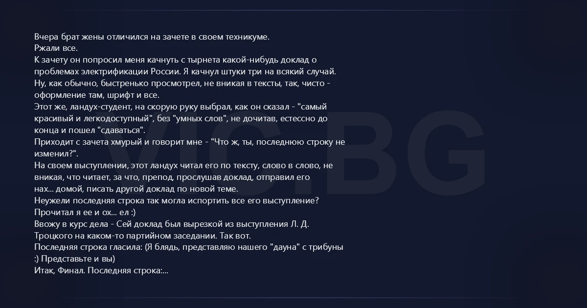 Вчера брат жены отличился на зачете в своем техникуме. Ржали все. К зачету он попросил меня качнуть с тырнета какой-нибудь доклад о проблемах электрификации России. Я качнул штуки три на всякий случай. Ну, как обычно, быстренько просмотрел, не вникая в тексты, так, чисто - оформление там, шрифт и все. Этот же, ландух-студент, на скорую руку выбрал, как он сказал - "самый красивый и легкодоступный", без "умных слов", не дочитав, естессно до конца и пошел "сдаваться". Приходит с зачета хмурый и говорит мне - "Что ж, ты, последнюю строку не изменил?". На своем выступлении, этот ландух читал его по тексту, слово в слово, не вникая, что читает, за что, препод, прослушав доклад, отправил его нах... домой, писать другой доклад по новой теме. Неужели последняя строка так могла испортить все его выступление? Прочитал я ее и ох... ел :) Ввожу в курс дела - Сей доклад был вырезкой из выступления Л. Д. Троцкого на каком-то партийном заседании. Так вот. Последняя строка гласила: (Я блядь, представляю нашего "дауна" с трибуны :) Представьте и вы) Итак, Финал. Последняя строка: "Я КОНЧИЛ, ТОВАРИЩИ! С РЕВОЛЮЦИОННЫМ ПРИЗЫВОМ К ВАМ, ЛЕВ ДАВЫДОВИЧ ТРОЦКИЙ!" А теперь, гоните на меня пургу! Я уже выпил йаду. История - ацтой!