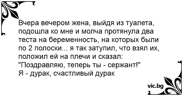 Вчера вечером жена, выйдя из туалета, подошла ко мне и молча протянула два теста на беременность, на которых были по 2 полоски... я так затупил, что взял их, положил ей на плечи и сказал: