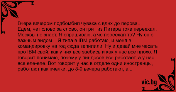 Едем, чет слово за слово, он грит из Питера тока переехал, Москвы не знает. Я спрашиваю, а че переехал то? Ну он с важным видом... Я типа в IBM работаю, и меня в командировку на год сюда запилили. Ну и давай мне чесать про IBM свой, как у них все заебись и как у нас все плохо. Я говорит понимаю, почему у пиндосов все работает, а у нас все еле-еле. Вот говорит у нас в отделе одни иностранцы, работают как пчелки, до 8-9 вечера работают, а потом начальник встает и говорит - А айда ребята в ресторан все! Я плачу! И вот тут понимаешь, зачем нужны корпоративы, тим билдинг вся хуйня! Вот это круто говорит! У нас можно пиццу в офис на обед заказать и фирма все оплачивает, понимаешь, что фирме ты небезразличен. И сидит с довольным видом)