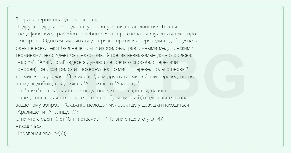 Вчера вечером подруга рассказала... Подруга подруги преподает в у первокурстников английский. Тексты специфические, врачебно-лечебные. В этот раз попался студентам текст про "Гонорею". Один оч. умный студент резво принялся переводить, дабы успеть раньше всех. Текст был нелегким и изобиловал различными медицинскими терминами, но студент был находчив. Встретив незнакомые до этого слова: "Vаginа", "Аnаl", "оrаl" (здесь я думаю идет речь о способах передачи гонореи), он исхитрился и "повернул напрямик" - перевел только первый термин - получилось "Влагалище", два других термина были переведены по этому подобию, получилось "Аралище" и "Аналище"... ... с "этим" он подходит к преподу, она читает.... садиться, плачет, встает, снова садиться, плачет, смеется, буря эмоций))) отдышавшись она задает ему вопрос - "Скажите молодой человек где у девушки находиться "Аралище" и "Аналище"??? ... на что студент (лет 18-ти) отвечает - "Не знаю где это у ЭТИХ находиться". Прозвенел звонок)))))