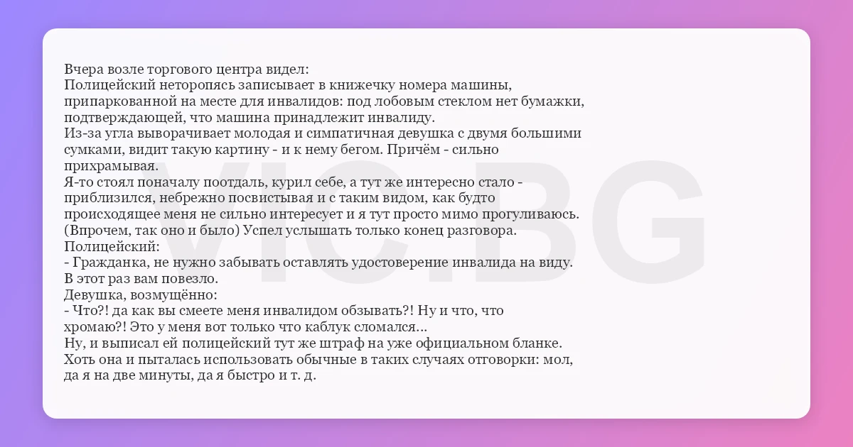 - Гражданка, не нужно забывать оставлять удостоверение инвалида на виду.