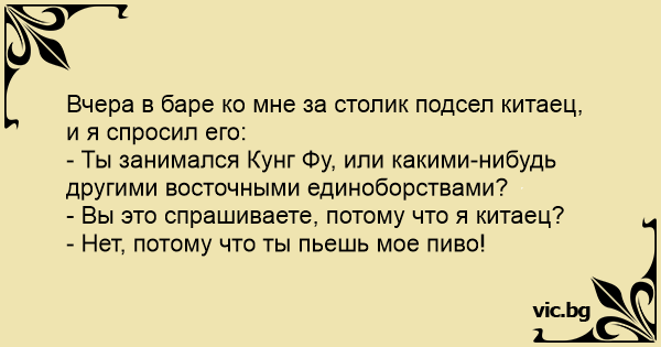 Вчера в мой любимый бар зашел китаец. Я спросил, знает ли он кунг-фу или какие нибудь боевые искуства.