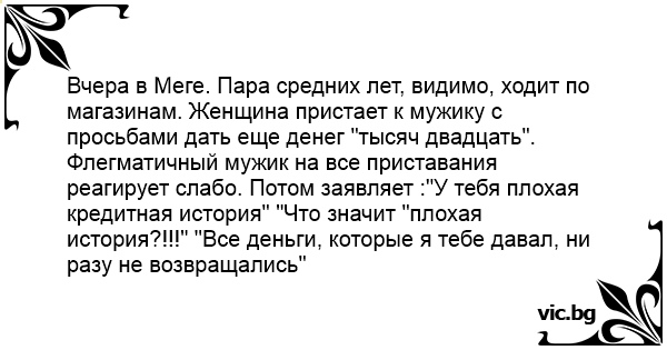 Вчера в Меге. Пара средних лет, видимо, ходит по магазинам. Женщина пристает к мужику с просьбами дать еще денег "тысяч двадцать". Флегматичный мужик на все приставания реагирует слабо. Потом заявляет :"У тебя плохая кредитная история" "Что значит "плохая история?!!!" "Все деньги, которые я тебе давал, ни разу не возвращались"