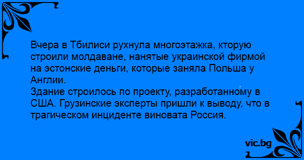 Вчера в Тбилиси рухнула многоэтажка, кторую строили молдаване, нанятые украинской фирмой на эстонские деньги, которые заняла Польша у Англии.