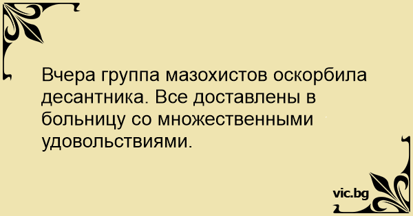 Вчера группа мазохистов оскорбила десантника. Все доставлены в больницу со множественными удовольствиями.