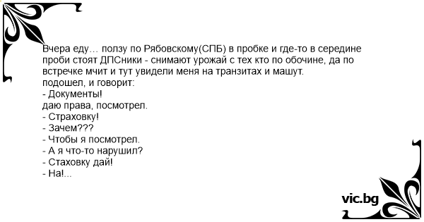 Вчера еду… ползу по Рябовскому(СПБ) в пробке и где-то в середине проби стоят ДПСники - снимают урожай с тех кто по обочине, да по встречке мчит и тут увидели меня на транзитах и машут. подошел, и говорит: - Документы! даю права, посмотрел. - Страховку! - Зачем??? - Чтобы я посмотрел. - А я что-то нарушил? - Стаховку дай! - На! - Техпаспорт! - Что? - Свидетельство о регистрации! - А вы видели что машина на транзитах?! - … ПТС покажи! - Вы протокол составлять собираитесь?! - Зачем? - Вот и я думаю, зачем вам ПТС! - Не eби мозг! Давай ПТС и едь! - Без ПТС??? - Да с ПТСом поедешь! - Смотрите… вот договор купли-продажи, доверенность, ИНН, пенсионное, паспорт жены… - Хорошо езжайте… (отходит) - Лейтенант, и как теперь я буду вклиниваться в пробку??? Или можно по обочине??? - Нельзя по обочине! Инспектор остановил движение, что-бы пропустили меня. Вот какой оказался хороший человек на самом деле!!!