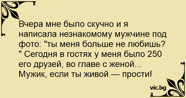 Вчера мне было скучно и я написала незнакомому мужчине под фото: "ты меня больше не любишь? " Сегодня в гостях у меня было 250 его друзей, во главе с женой...