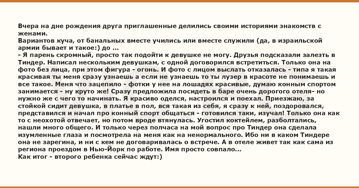 Вчера на дне рождения друга приглашенные делились своими историями знакомств с женами. Вариантов куча, от банальных вместе учились или вместе служили (да, в израильской армии бывает и такое:) до ... - Я парень скромный, просто так подойти к девушке не могу. Друзья подсказали залезть в Тиндер. Написал нескольким девушкам, с одной договорился встретиться. Только она на фото без лица, при этом фигура - огонь. И фото с лицом выслать отказалась - типа я такая красивая ты меня сразу узнаешь а если не узнаешь то ты лузер в красоте не понимаешь и все такое. Меня что зацепило - фотки у нее на лошадях красивые, думаю конным спортом занимается - ну круто же! Сразу предложила посидеть в баре очень дорогого отеля- но нужно же с чего то начинать. Я красиво оделся, настроился и поехал. Приезжаю, за стойкой сидит девушка, в платье в пол, вся такая из себя, я сразу к ней, поздоровался, представился и начал про конный спорт общаться - готовился таки, изучал! Только она как то с неохотой отвечает, но потом вроде втянулась. Угостил коктейлем, разболтались, нашли много общего. И только через полчаса на мой вопрос про Тиндер она сделала изумленные глаза и посмотрела на меня как на ненормального. Ибо ни в каком Тиндере она не зарегина, и ни с кем не договаривалась о встрече. А в отеле живет так как сама из региона проездом в Нью-Йорк по работе. Имя просто совпало... Как итог - второго ребенка сейчас ждут:)