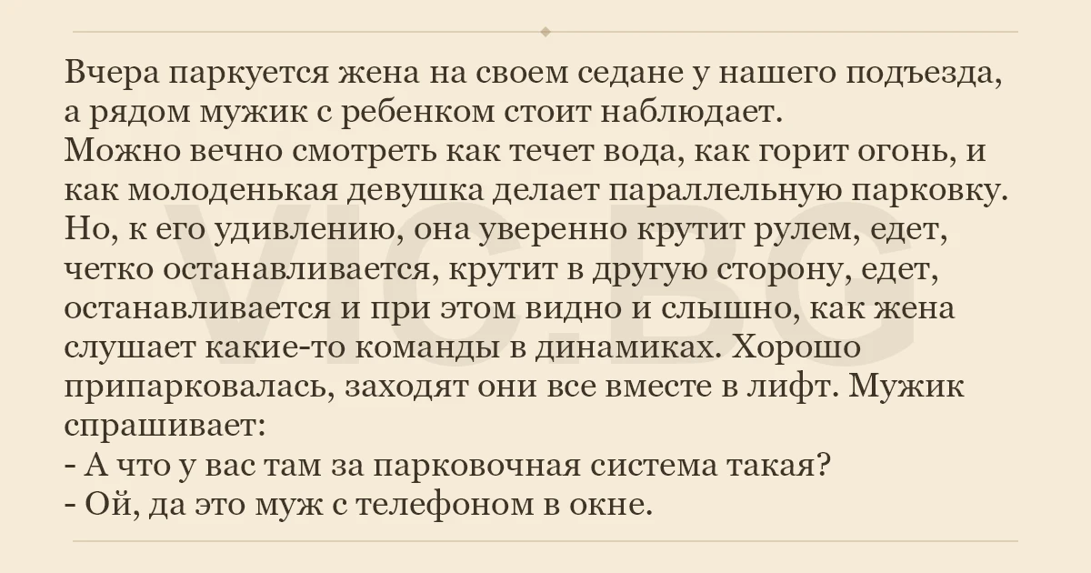 Вчера паркуется жена на своем седане у нашего подъезда, а рядом мужик с ребенком стоит наблюдает. Можно вечно смотреть как течет вода, как горит огонь, и как молоденькая девушка делает параллельную парковку. Но, к его удивлению, она уверенно крутит рулем, едет, четко останавливается, крутит в другую сторону, едет, останавливается и при этом видно и слышно, как жена слушает какие-то команды в динамиках. Хорошо припарковалась, заходят они все вместе в лифт. Мужик спрашивает: - А что у вас там за парковочная система такая? - Ой, да это муж с телефоном в окне.