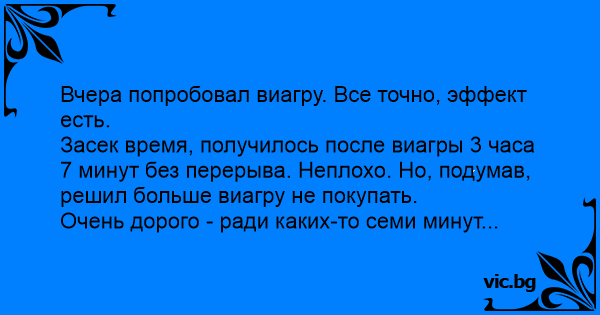 Засек время, получилось после виагры 3 часа 7 минут без перерыва. Неплохо. Но, подумав, решил больше виагру не покупать.